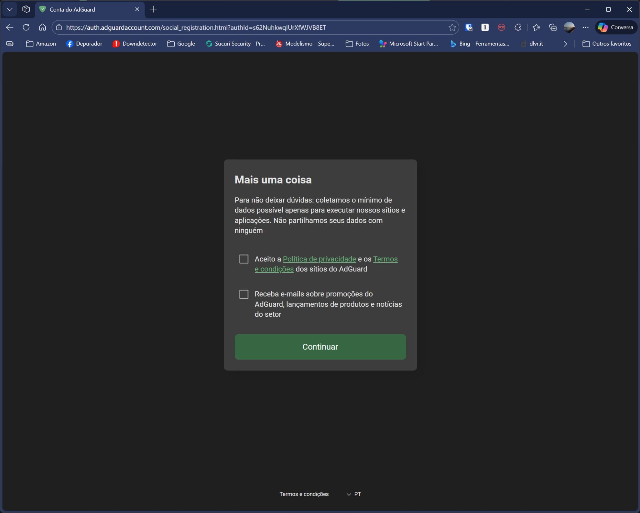 1- Em primeiro lugar, crie uma conta em adguard.com e clique em ‘Iniciar sessão’ no canto superior direito da página. Terá de fornecer um endereço de e-mail válido (ou clicar nos botões de login com outros serviços), que será usado para aceder à conta. No ecrã seguinte, aceite os termos de utilização do serviço e clique em ‘Continuar’. Se não clicou nos botões como o ‘Login com o Google’, vai receber um código no e-mail que usou para autenticar o endereço.