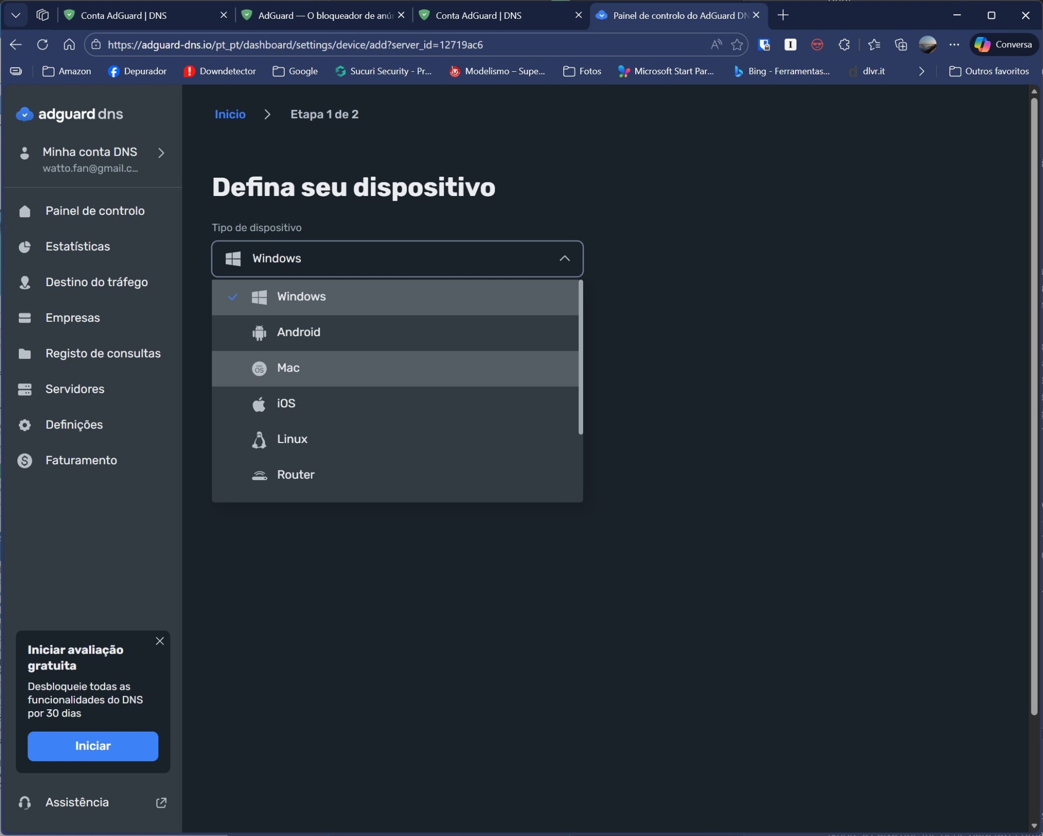 2- Depois de entrar no serviço, clique em ‘AdGuard DNS’ na coluna da esquerda. Ignore a caixa que lhe pede para fazer uma assinatura e indique que vai usar o serviço no modo pessoal. Na página principal, clique no botão ‘Conectar dispositivo’. Na página seguinte escolha o sistema operativo que vai usar; neste caso, como estamos a falar de telemóveis, escolha Android ou iOS e dê um nome ao dispositivo. Clique em ‘Use os aplicativos AdGuard’. Abre-se uma zona para baixo que tem um QR-Code que serve para configurar a app para o seu dispositivo. Por baixo, está também um código, caso queira fazer a configuração manualmente.