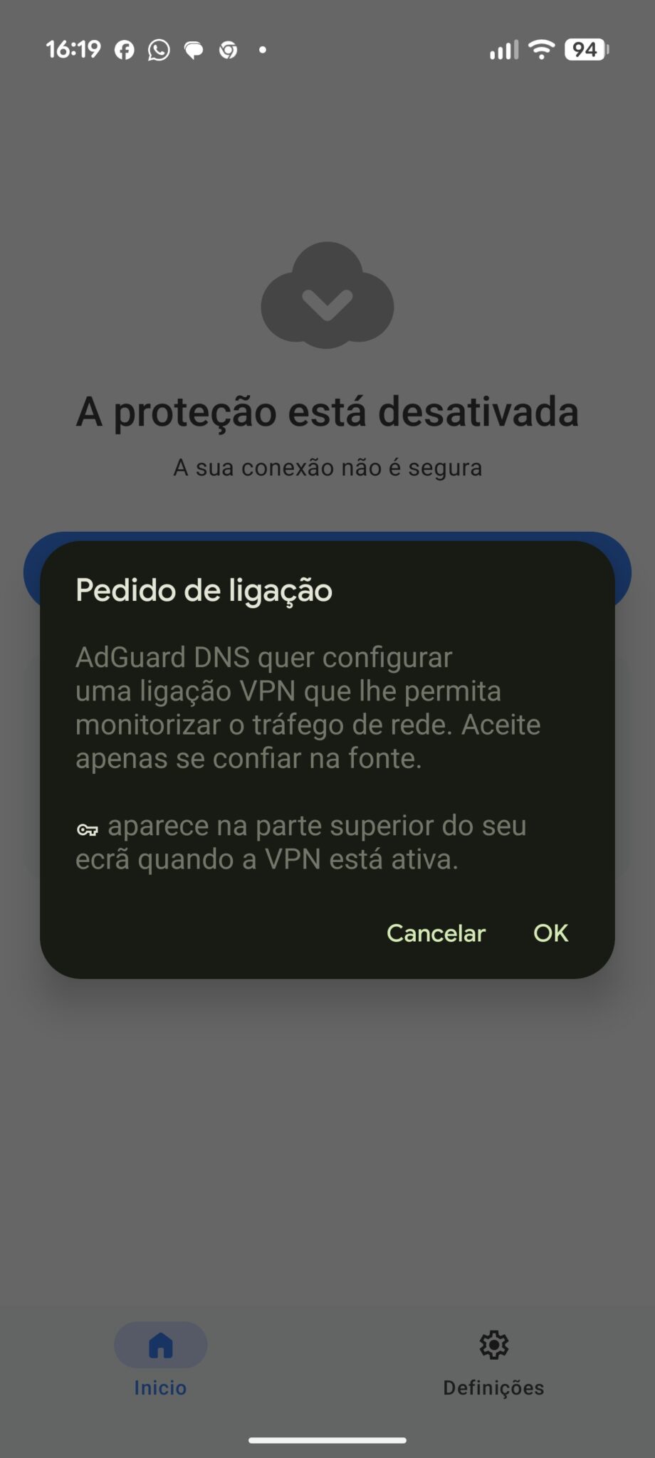 4- No ecrã seguinte, aparece a indicação ‘A proteção está desativada’ – toque em ‘Ativar’. Surge um pedido para criar um perfil VPN, por isso, clique em ‘Permitir’. A seguir, aparece mais um pedido de permissão para a criação de uma VPN que monitoriza o tráfego; como é isto mesmo que é pretendido, clique em ‘OK’. Depois, clique em ‘Ativar’ outra vez para ligar o AdGuard. Se reparar, no topo do ecrã aparece uma chave que indica que a ligação da VPN está a funcionar.