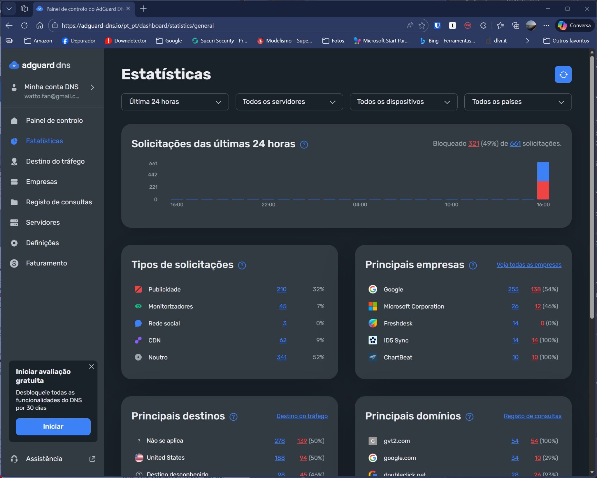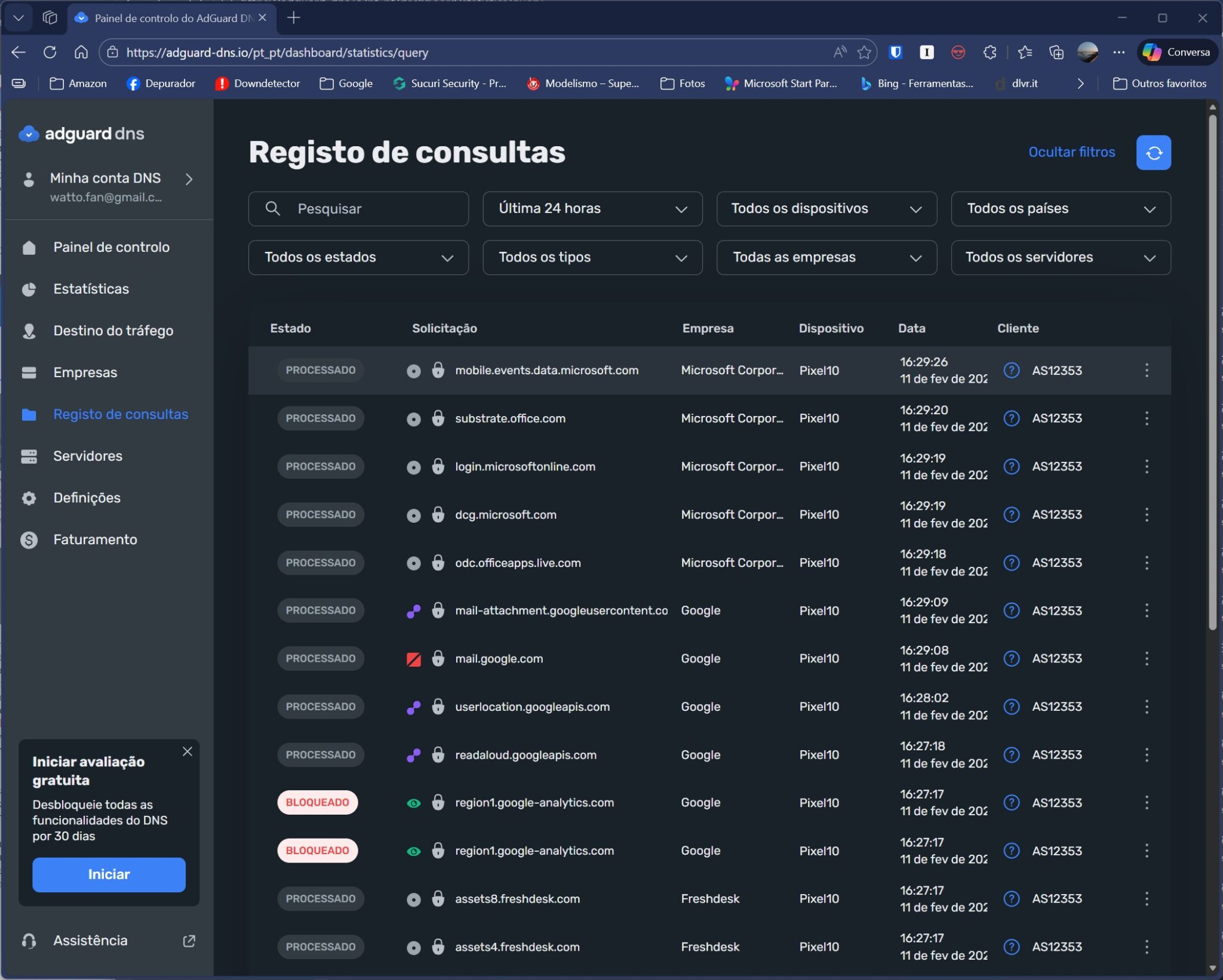 5- Use a Internet como sempre fez, mas, agora, todo o tráfego é redireccionado através do AdGuard, o que remove a publicidade das páginas. Se aceder à página do AdGuard DNS no seu computador, pode ver a quantidade de anúncios que foram bloqueados. Clique em ‘Registo de consultas’ na coluna da esquerda para ver o que foi deixado passar e o que foi bloqueado. Se precisar de aceder a um dos domínios que foram bloqueados, clique nos três pontos à direita do nome e escolha ‘Desbloquear domínio’.