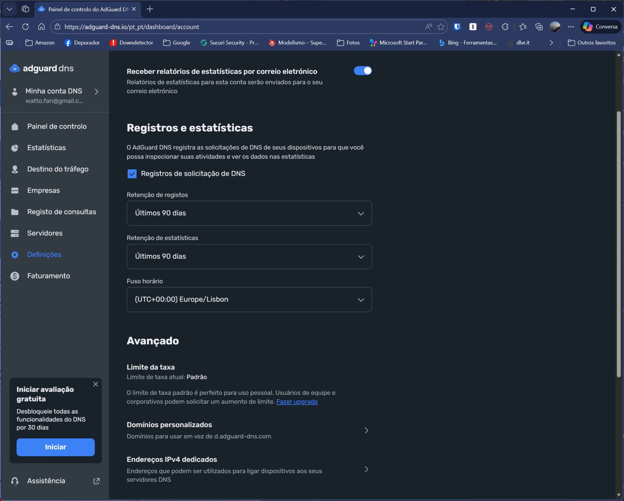 7- Se não quiser que estas informações sejam guardadas, pode desligar esta funcionalidade: clique em ‘Definições’ na coluna da esquerda e, na página seguinte, desmarque a caixa ‘Registos e estatísticas’. Na mesma página, também pode desligar a funcionalidade de envio de e-mails com a informação; para tal, use o interruptor junto a ‘Receber relatórios de estatísticas por correio electrónico’.