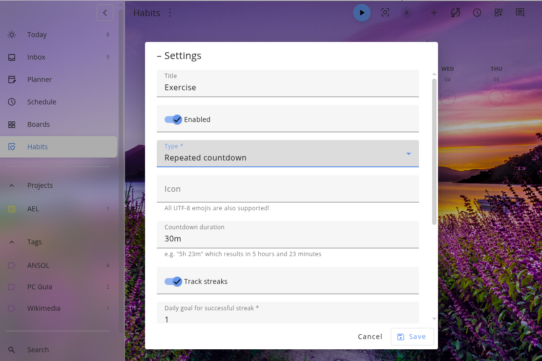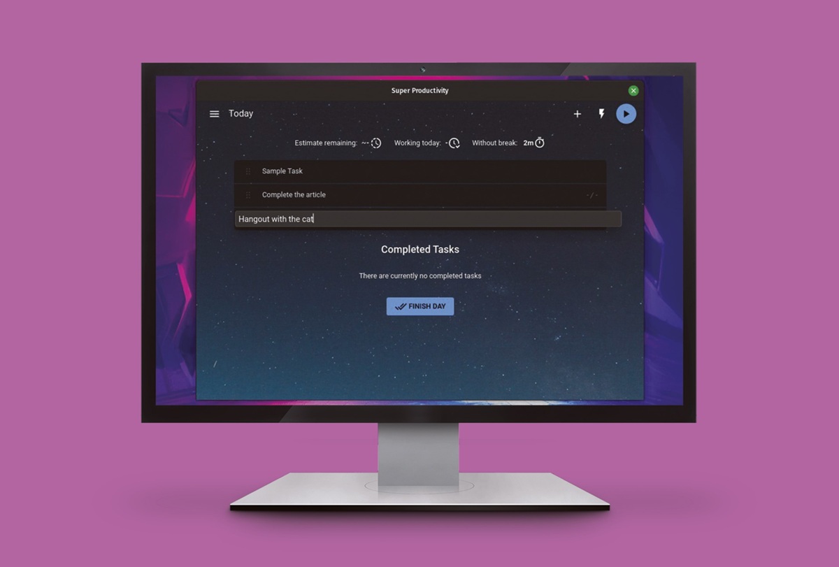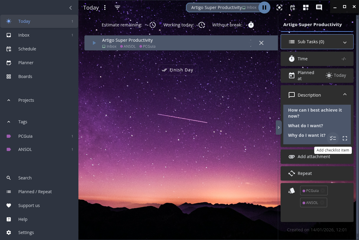 Numa actualização recente, foi acrescentada uma secção de hábitos, que nos permite registar as actividades que queremos promover na nossa vida, seja uma caminhada algumas vezes por semana, trinta minutos de leitura diária ou beber uma determinada quantidade de água por dia. Também podemos ligar o Super Productivity ao nosso calendário ou a serviços de outras plataformas; e, claro, exportar todos estes dados a partir da secção ‘Worklog’, o que é particularmente útil para quem precisa de fazer relatórios de tempo de trabalho.