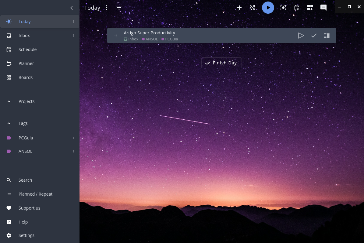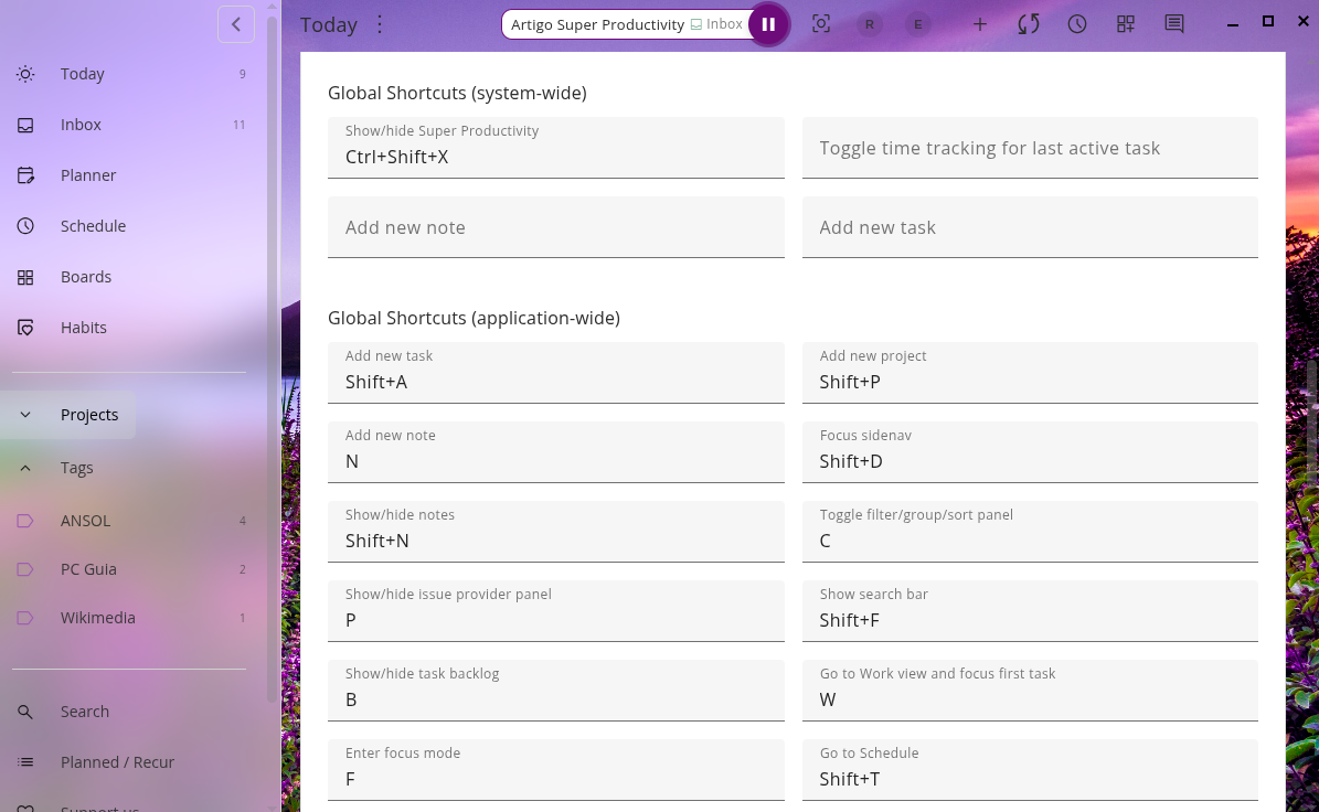 Este programa permite personalizar a imagem de fundo e as cores que queremos definir para as etiquetas e projetos. Para adicionarmos uma tarefa, podemos clicar no ‘+’ ou usar os atalhos do teclado por omissão ou definir novos.