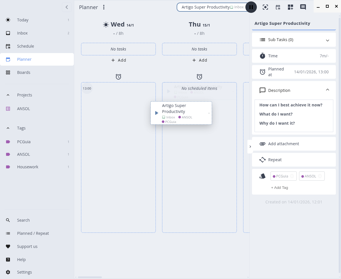 Na secção ‘Planner’ temos a lista de tarefas divididas por calendarizadas ou não e, na secção ‘Schedule’, temos uma vista de calendário. Em ambas, podemos criar novas tarefas com um clique ou arrastar cada tarefa para alterar a data.