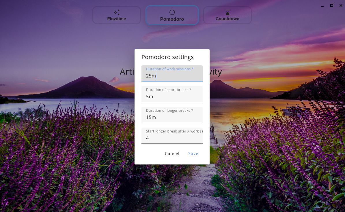Relativamente à gestão de tempo, é possível usar as pré-definições ou fazer alterações, como por exemplo, determinar quando, e por quanto tempo, fazemos intervalos para descanso. Se escolhermos entrar no modo ‘Focus’, podemos usar uma contagem de tempo flexível, escolher o conhecido sistema Pomodoro ou, simplesmente, optar por uma contagem regressiva.