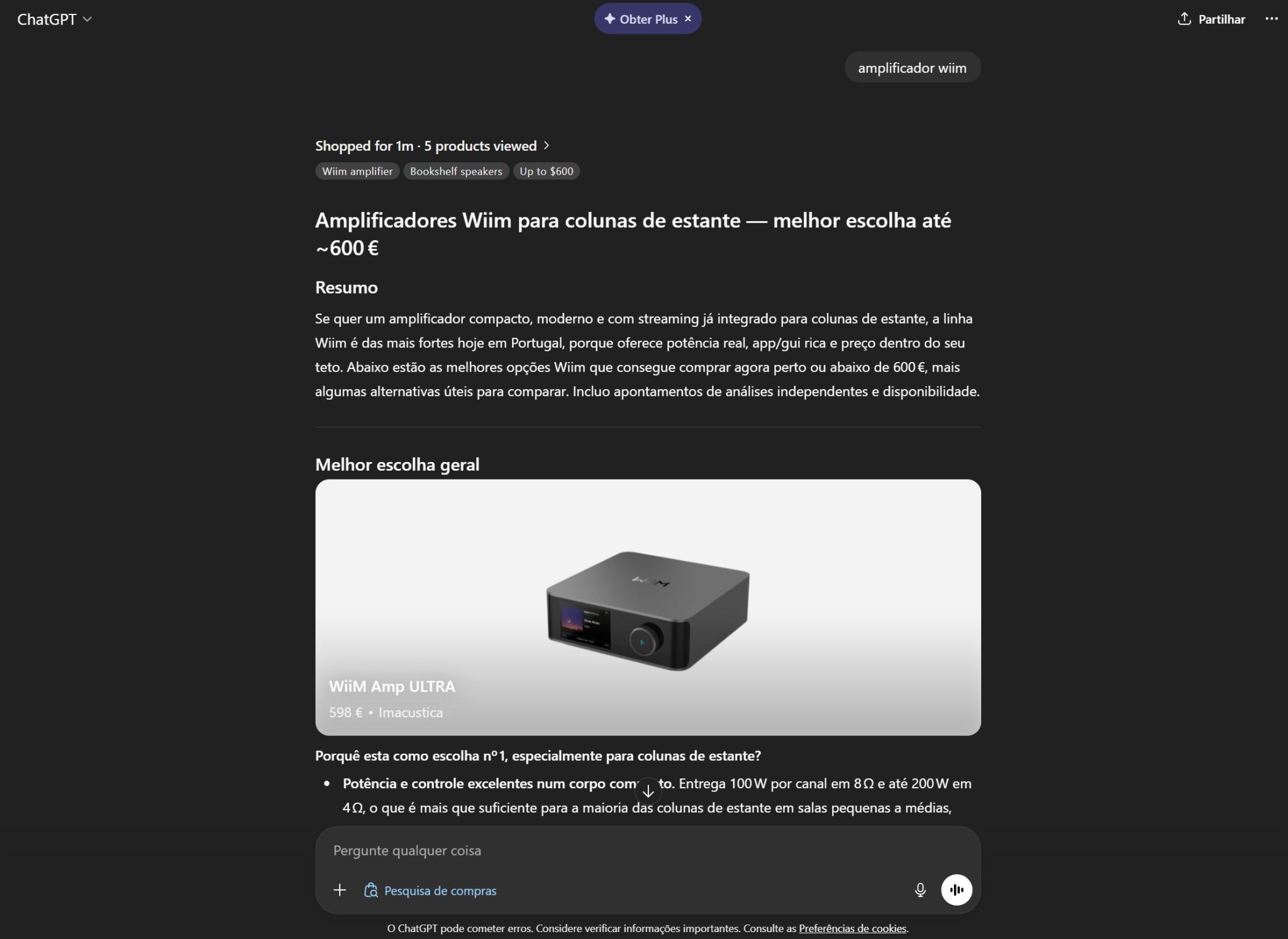 O ChatGPT inclui, agora, uma funcionalidade de ‘Pesquisa de compras’ que oferece informações e conselhos sobre produtos que pretenda adquirir. Esta funcionalidade faz perguntas para perceber exactamente o que procuramos, dá dados actualizados de fontes fiáveis e permite refinar os resultados. Clique no botão ‘Research’ (‘Pesquisar’) depois de fazer uma ‘Pesquisa de compras’ e seleccione ‘Get started’ (‘Começar’). Como resultado, são-nos dados detalhes de preços, disponibilidade, prós/contras de cada recomendação e conselhos de compra relevantes.