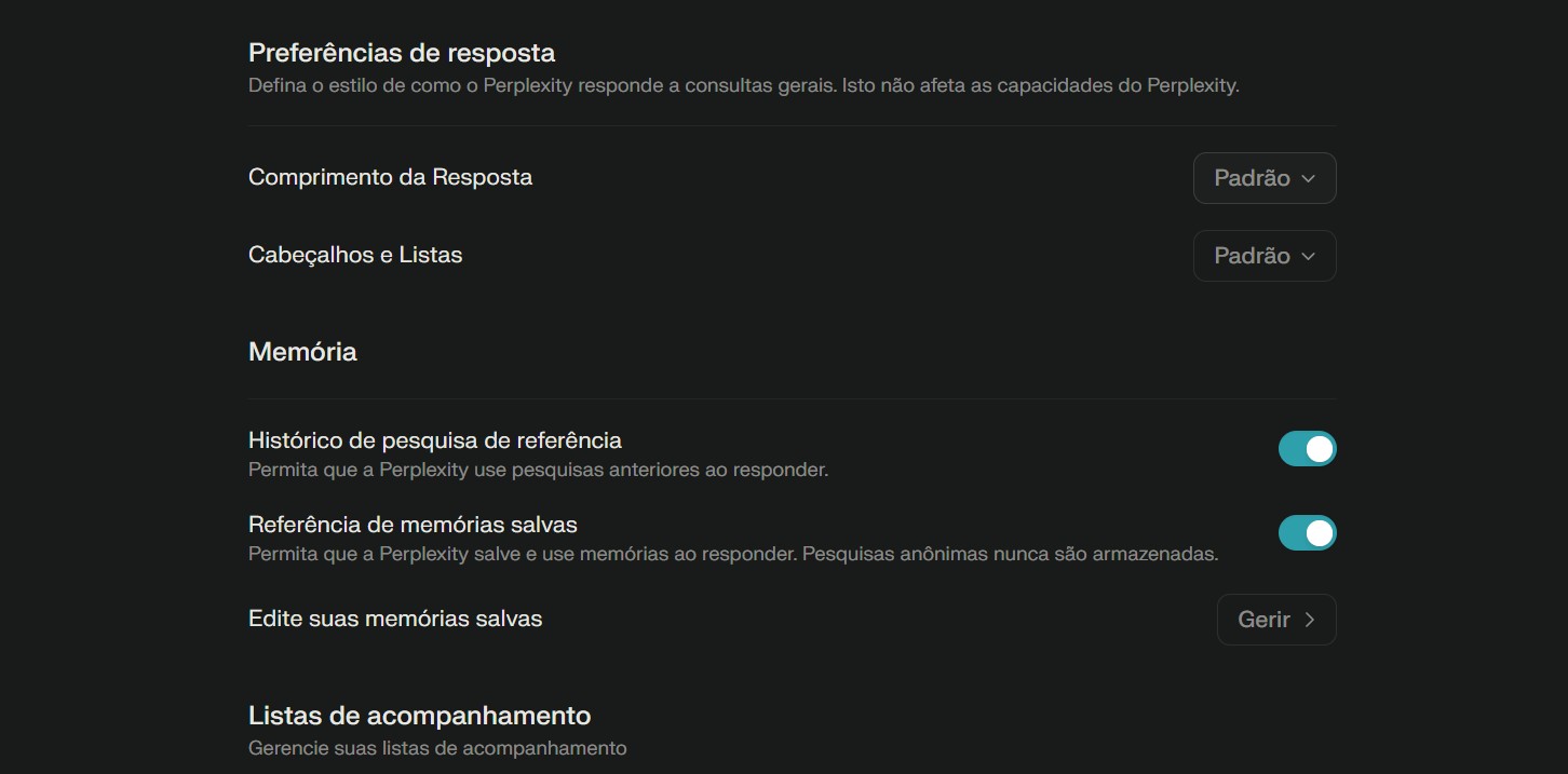 A Perplexity introduziu uma funcionalidade que memoriza os nossos interesses e gostos para oferecer respostas mais personalizadas. Estas opções vêm activadas por defeito, mas podem ser desligadas se considerar que invadem a sua privacidade. Para configurar, clicamos no ícone da nossa conta, seleccionamos ‘Personalização’ e, na secção ‘Memóri’a, desactivamos as opções ‘Histórico de pesquisa de referência’ (que impede a consulta de pesquisas anteriores) e a ‘Referência de memórias salvas’ (impede que a ferramenta guarde detalhes que forneça). Se quiser, pode apagar memórias específicas ao clicar no botão ‘Gerir’, que fica perto de ‘Edite suas memórias salvas’, no mesmo ecrã.