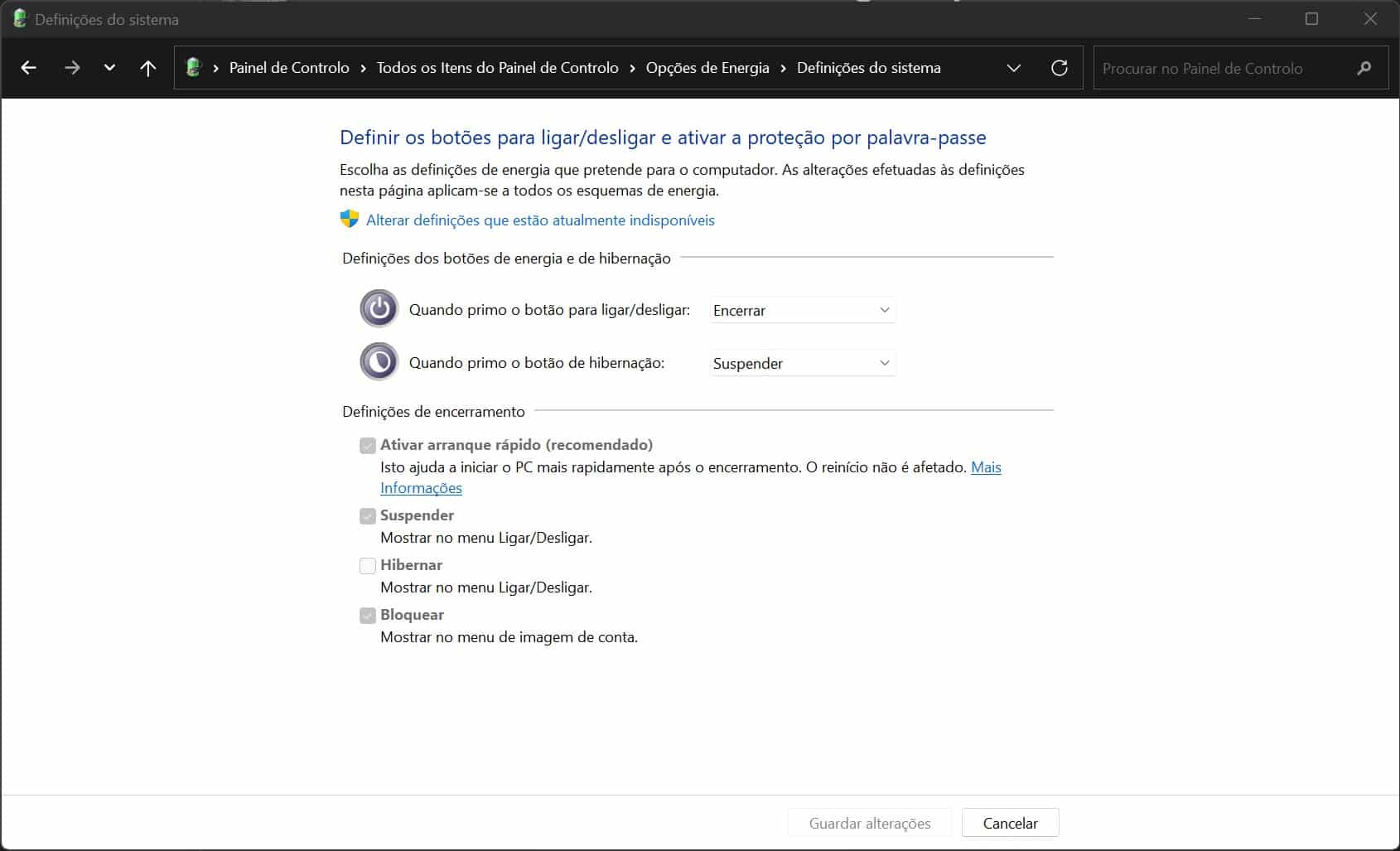 Em ‘Definições de encerramento’, ligue a opção ‘Hibernar’ e depois clique em ‘Guardar alterações’.